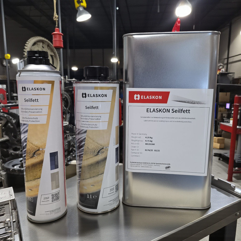 Nachschmiermittel zur Schmierung und Konservierung von Drahtseilen. Es wird speziell bei Förderseilen von Bergbahnen und bei Aufzugseilen eingesetzt. Infolge der guten Kriech- und Haftfähigkeit auch als Unterbodenschutz im Kfz-Bereich und als Hohlraumkonservierung geeignet. Elaskon Seilfett ist flüssig und enthält ein aromatenfreies Lösungsmittel. Nach Verdunstung des Lösungsmittels wird ein grifffester Film auf den Oberflächen gebildet. Es ist feuchtigkeitsunterwandernd und verfügt über gutes Haftvermögen bei optimalen Korrosionsschutzeigenschaften. Erfüllt die ISO 4345, ISO 3156, DIN EN 12385-8, die Österreichischen Drahtseilbedingnisse DSB 80.